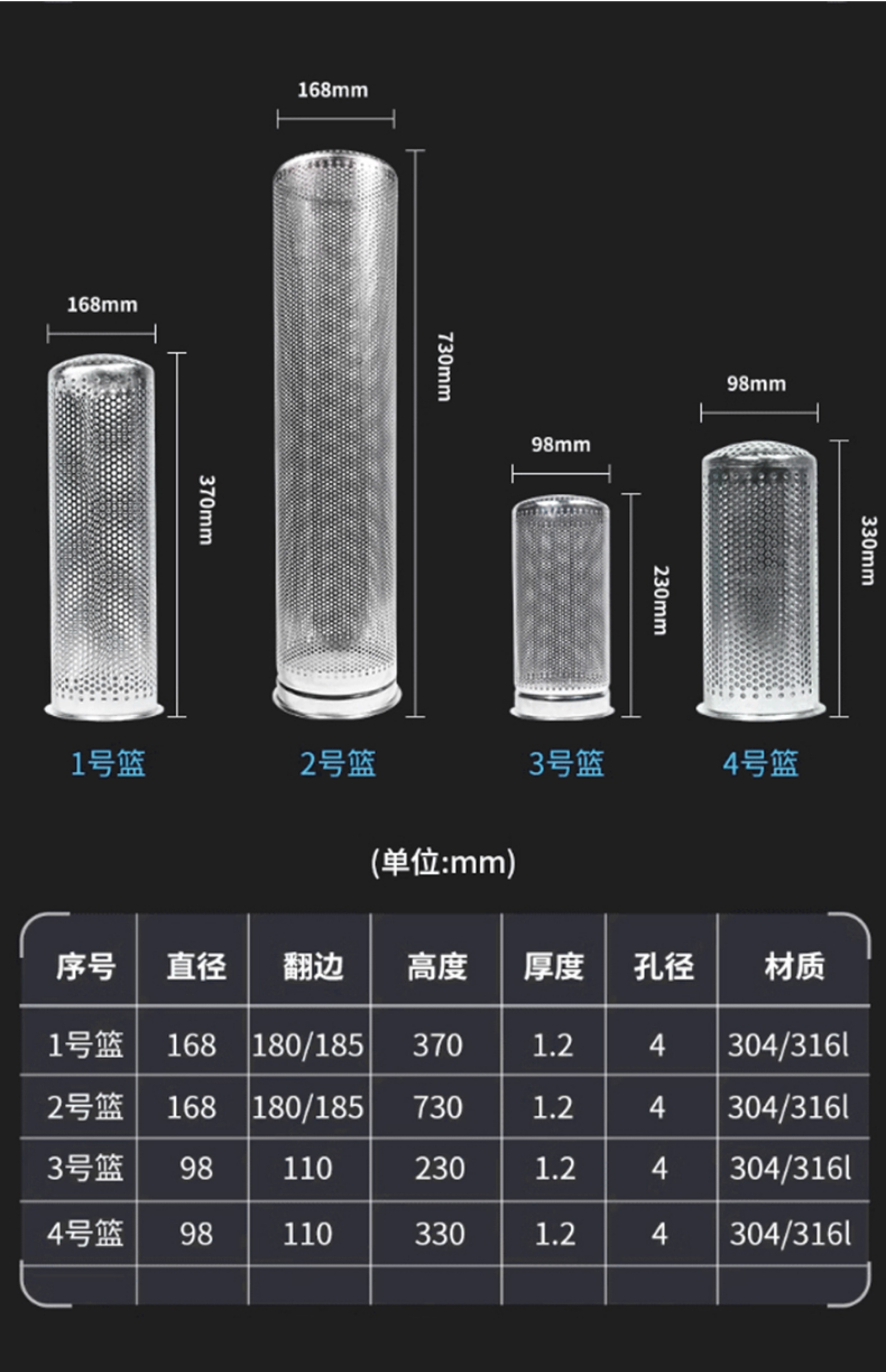 滤筒材质 304、304L、316、316L不锈钢冲孔网、编织网、电焊网,黄铜网、铝箔网等。 滤筒特点 单多层点焊过滤筒、过滤器、过滤网,对1-500um颗粒、液体具有良好的过滤性,单位面积的流量大,清洗之后可反复使用。 制作工艺 经过裁板--卷圆--焊接---调圆--表面处理---成型 样式 有提篮式,双耳式,法兰式,篮式过滤筒.螺纹接口式等样式。 金属过滤网筒、网管、网桶、滤管,由不锈钢网、不锈钢冲孔网.铁网、不锈钢板、铁板焊接而成。可单层焊接、多层焊接,还可单层焊接后,再将金属过滤网筒、网管、网桶、滤芯、滤管重合穿插在一起,形成多层过滤。 适用范围 石油化工、油田管道过滤 水处理行业设备过滤 加油设备、工程机械设备燃油过滤 制药及食品加工领域